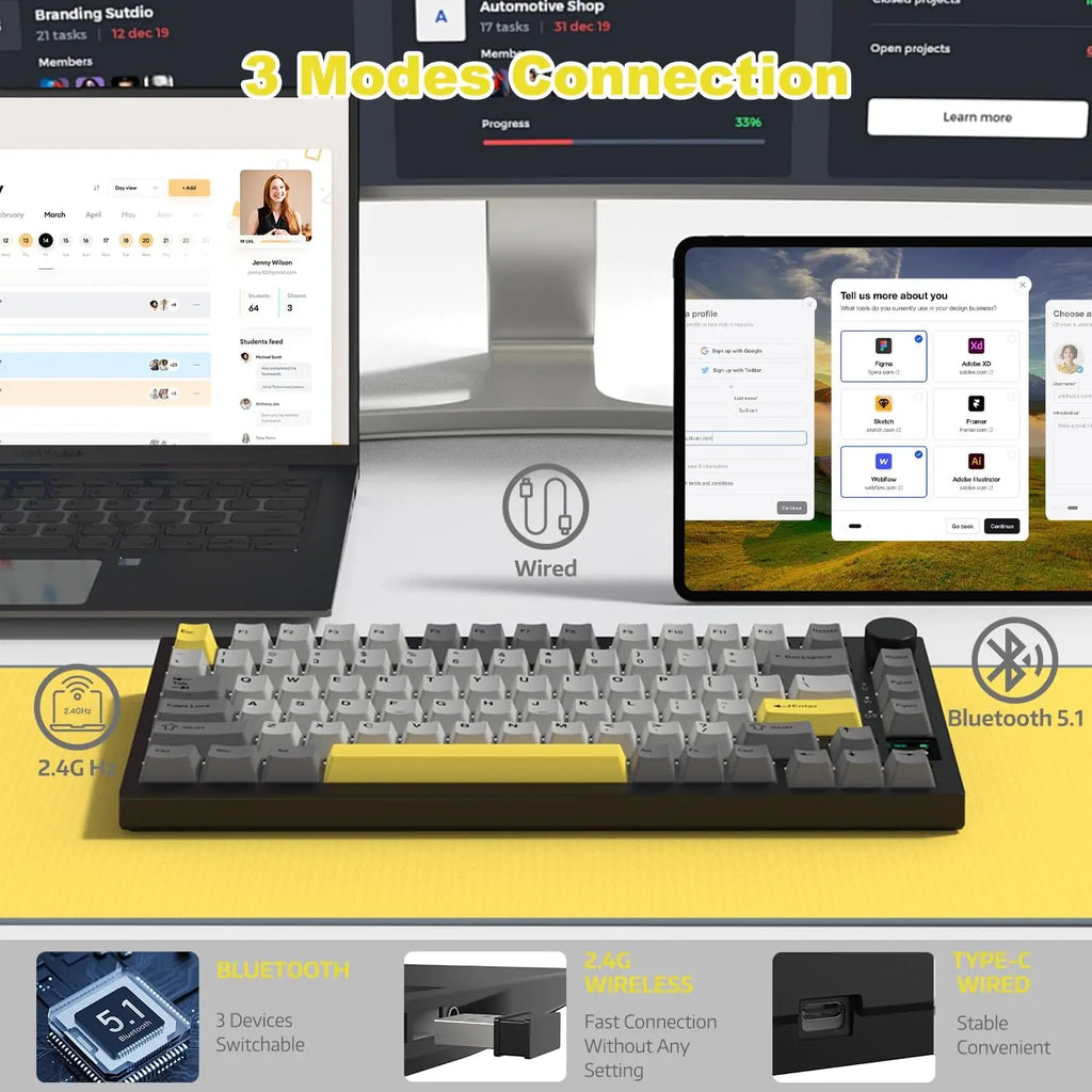 [Wireless & Wired Connectivity] The A.JAZZ 75 percent keyboard can easily switch among 3 connection via Bluetooth or 2.4GHz for wireless connectivity, or with the included Type-C USB cable.Compared with former versions,Bluetooth 5.1 mode is featured with faster responses,perfect for desktop computers, smartphones, tablets and laptops.With the built-in 4000mAh large-capacity battery,don’t worry for vacations and business trips.