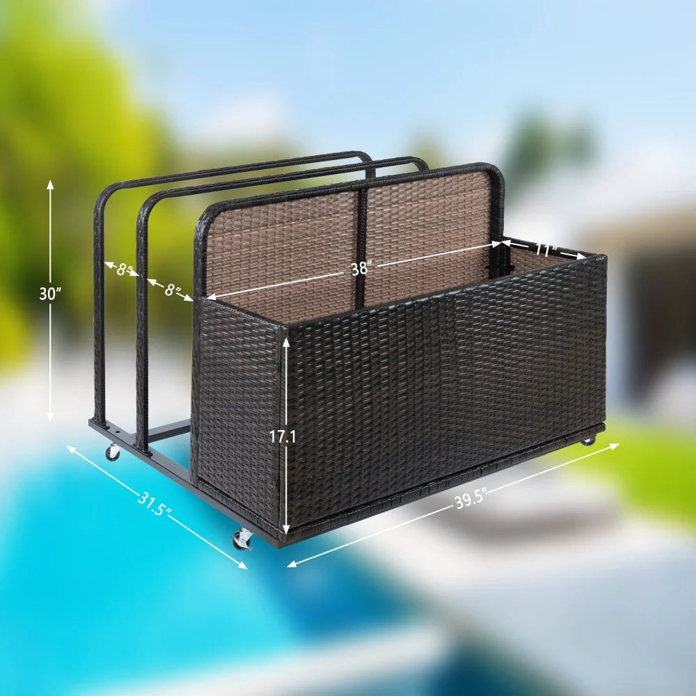 Rattan Storage Bin Info: Overall dimensions are 39.5"L x 31.5"W x 30"H, and the long storage basket measures 38"L x 11"W x 17.1"H, perfect for storing pool toys, buoys, pool noodles, towels, tables, and other back yard storage essentials. It also comes with two fixed dividers and a built-in basket so you can easily organize your outdoor space.