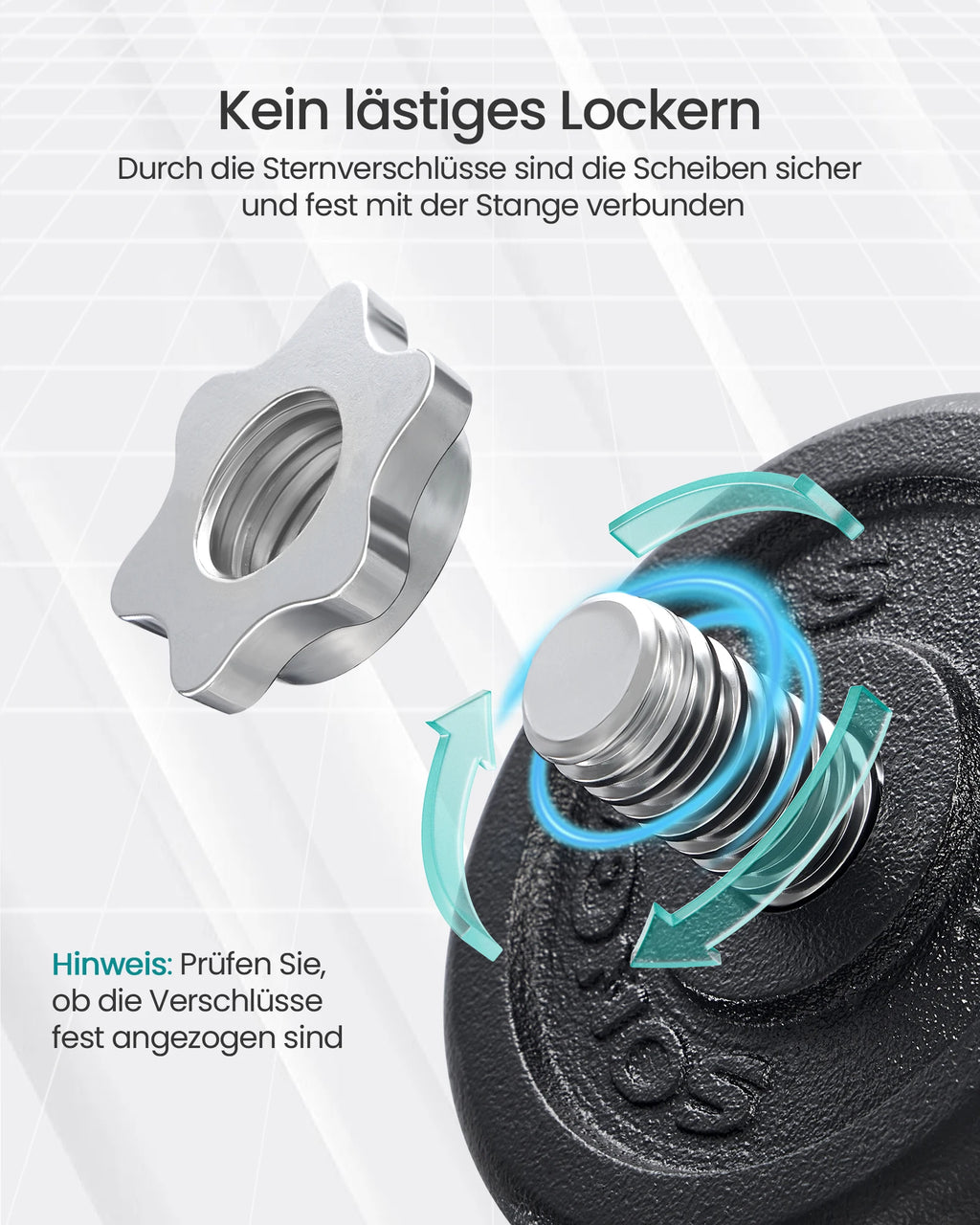 [Non-slip handles] The sturdy 14 cm long bars with non-slip corrugation on the surface provide a secure and comfortable hold; the 4 star locks prevent the weight discs from rattling annoyingly