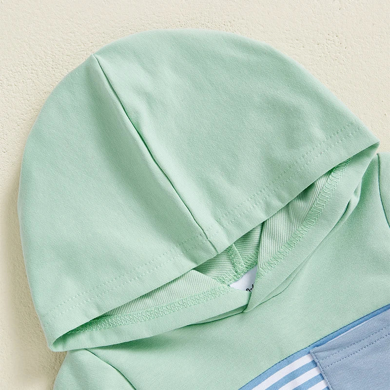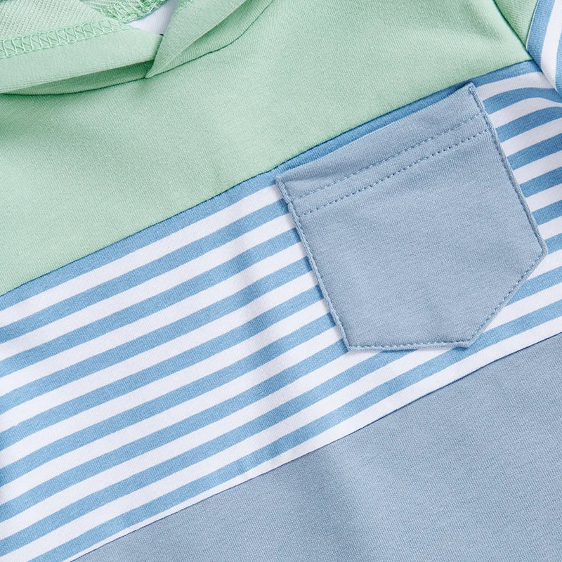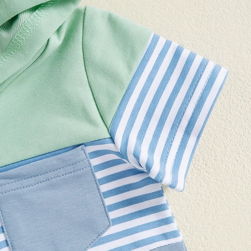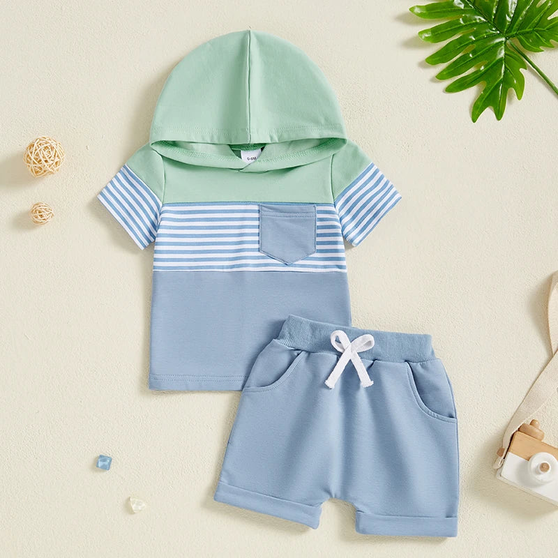 Baby Boys Shorts Set, Striped Contrast Color Hooded T-shirt with Elastic Waist Shorts Summer OutfiHe will love this 2-piece shorts set that includes a short sleeve T-shirt that matches a pair of shorts. Easy outfit!