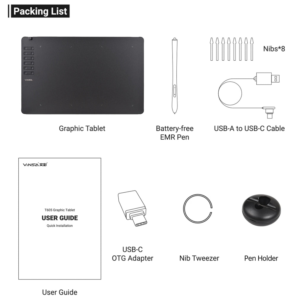 VINSA T1161 Graphics Drawing Tablet Ultra-thin Art Creation Sketch with Battery-free Stylus 8 Pen Nibs 8192 Levels Pressure