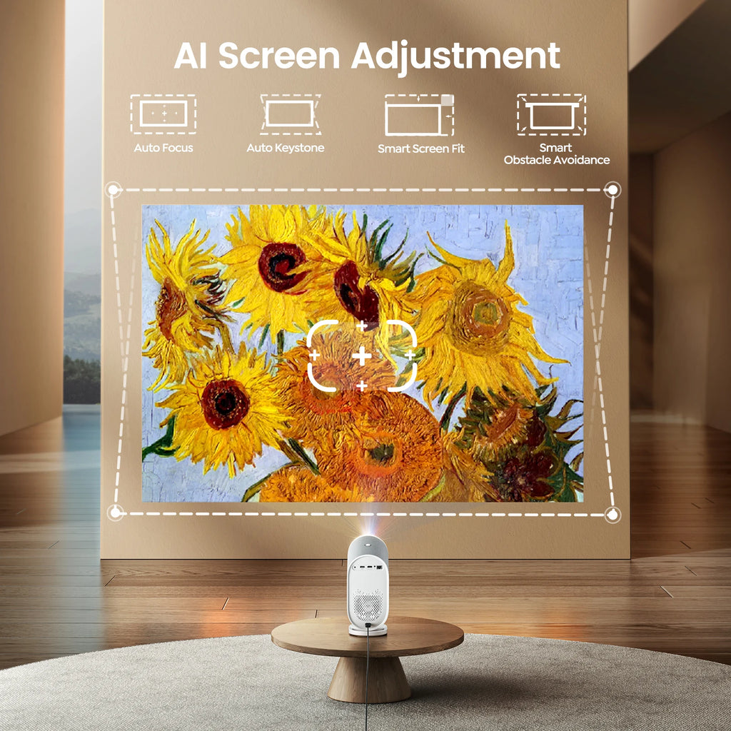 【AI Auto Focus & Keystone Correction, 50% Zoom】The 4k wifi bluetooth projector features AI Auto Focus/Keystone technology, and a built-in shift sensor ensures automatic correction, and also has Smart Obstacle Avoidance, Smart Screen Alignment。The WOS 2.0 system enhances focus speed by 50% compared to similar models, providing crisp, clear images in seconds, achieving perfect image quality in any scene. The 50%-100% zoom function allows you to adjust the image size without moving the projector to meet your multi-scene entertainment needs.