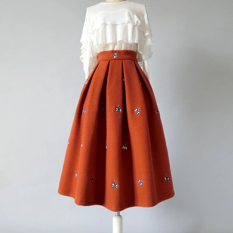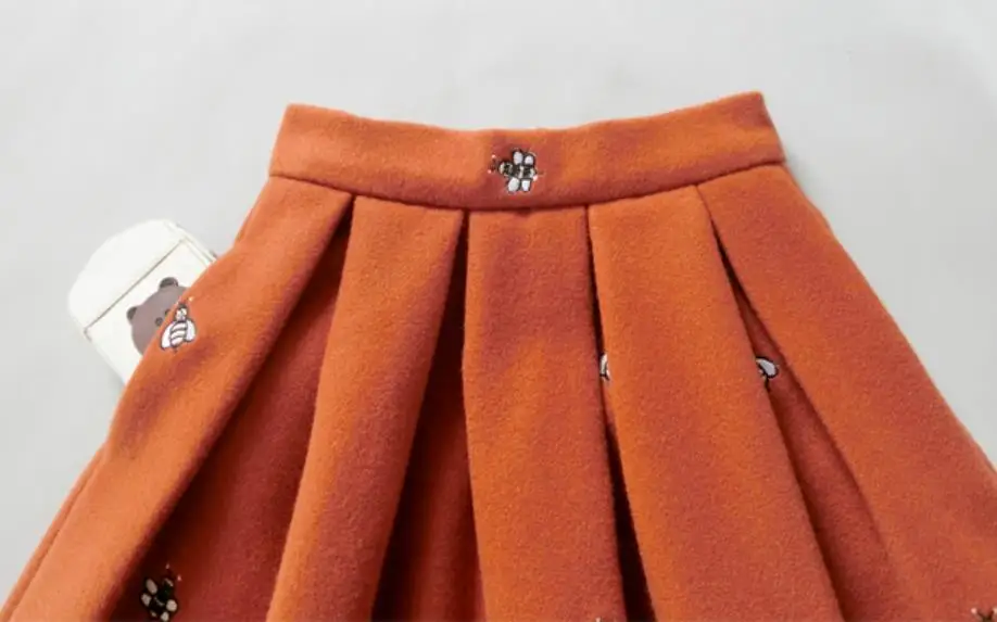 Autumn winter embroidered woolen skirt women high waist princess warm ball gown skirt
