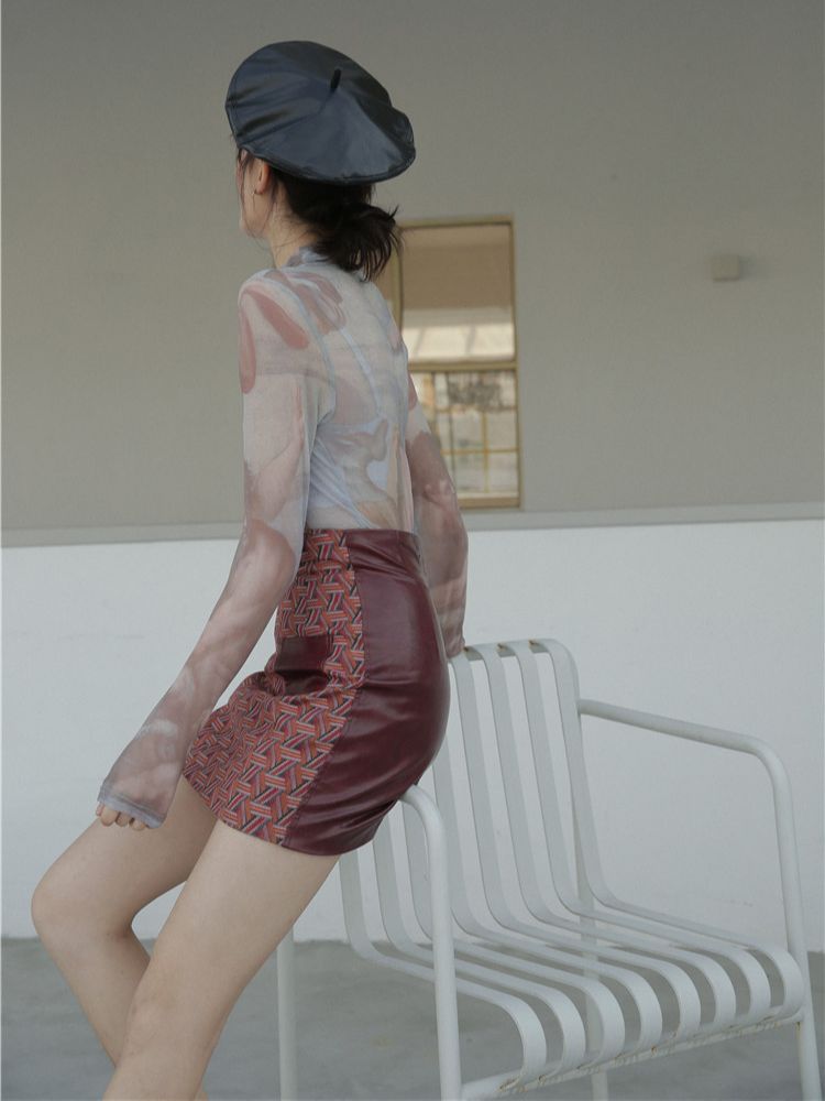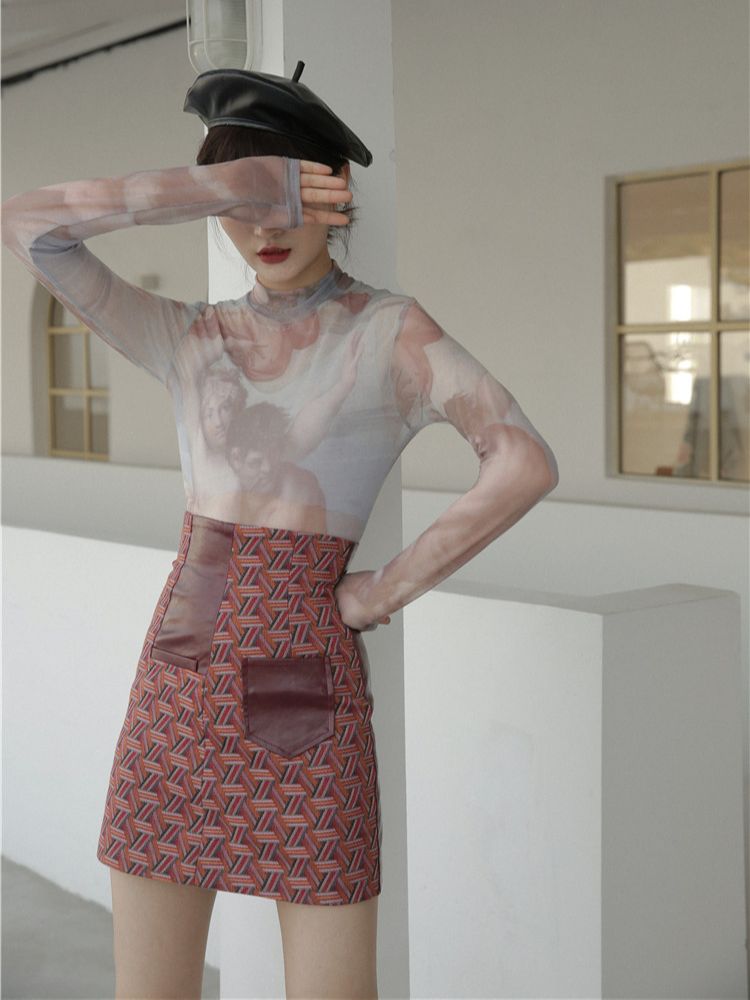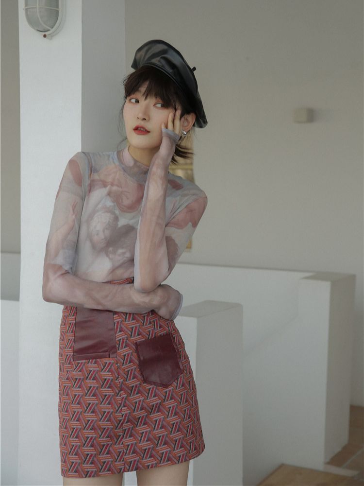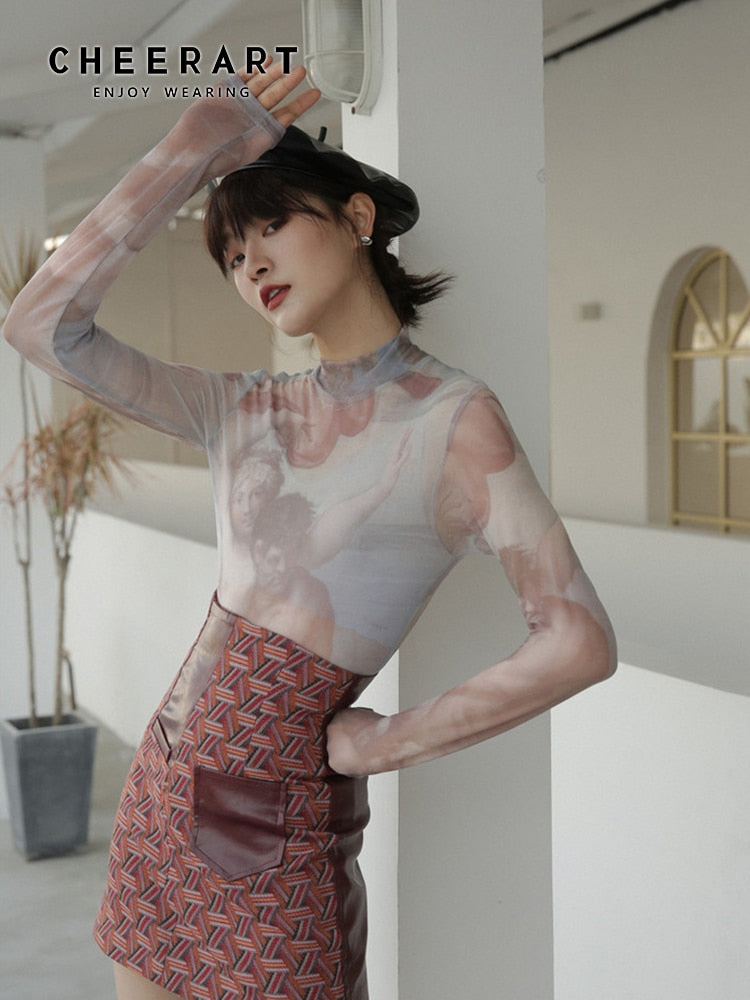 CHEERART Sheer T Shirt Women Turtle Neck Mesh Top Painting Print Long Sleeve Tee Shirt Femme Body Tight Underwear Fall Clothes