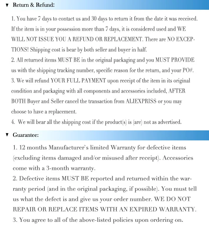 - If you have a problem or are not completely satisfied with your purchase, plz do not hesitate to contact us before leaving negative feedback.