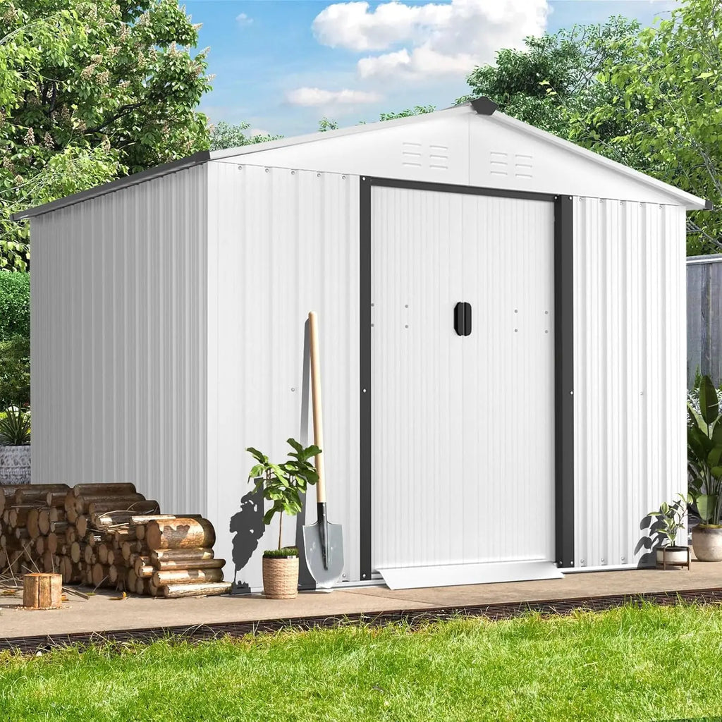 6X8 Ft Outdoor Storage Shed, Metal Shed Kit With Double Doorknobs And Air Vents, Double Sloping Roof Garden Shed, Galvanized Shed With Sliding Door (White)