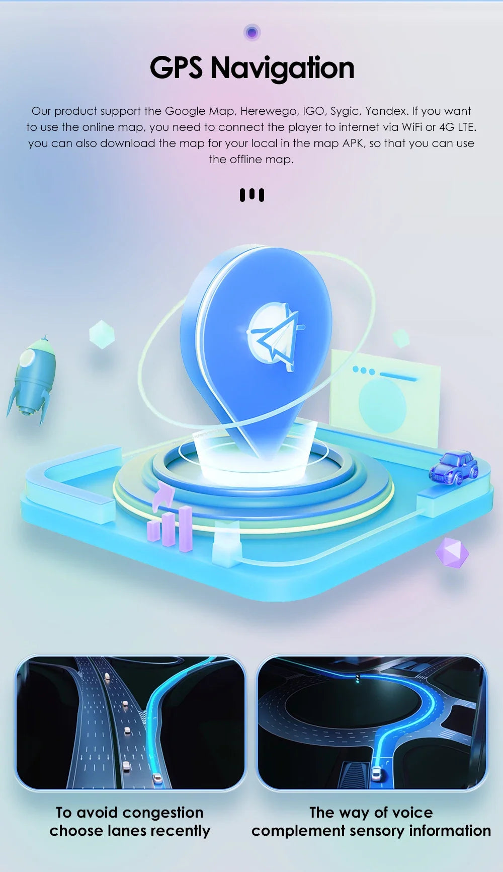 GPS Navigation: Supports Online and Off line Google map, Navitel, Waze, Herewego To avoid congestion choose lanes recently , the way of voice complement sensory information.