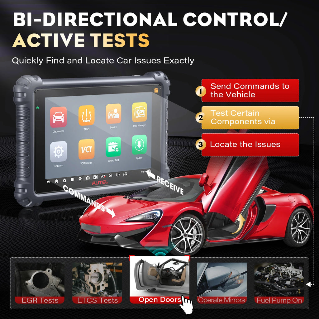 [Bidirectional Control/Active Tests] Locate problems precisely & fast. Widely used on fuel pumps, interior lights, a/c fan, inside mirrors, adaptive headlamp, steering wheel heating, windows, wash/wipe system, horn, etc.