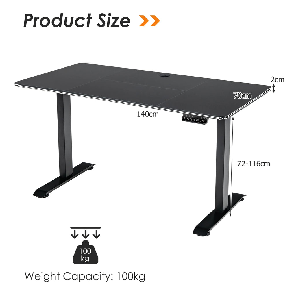 Color:Black Material: Steel, particle board Product dimensions: 140 x 70 x 72-116 cm (L x W x H) Net weight: 36 kg Adjustable height: 72-116 cm Maximum weight: 100 kg Maximum lifting weight Capacity: 70 kg Rated power: 52.2 -120 W Voltage: AC 100-240V, 50/60 HZ Speed: 25mm/s Package includes: 1 x Electric sit-stand desk 1 x Instruction manual