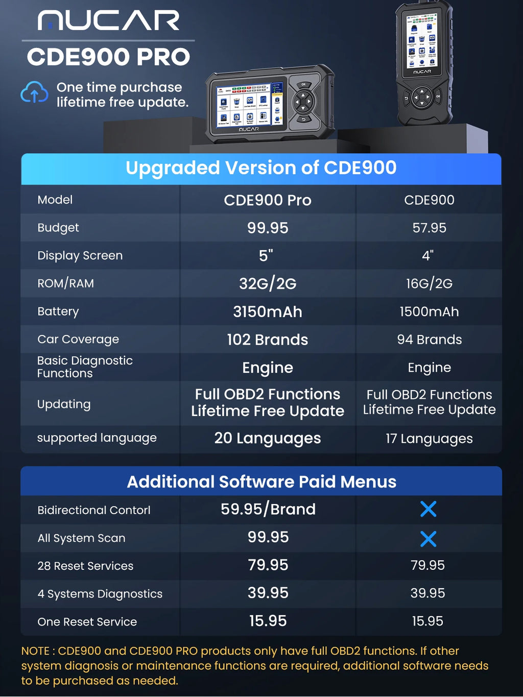 CDE900 Pro starts out as an enhanced obd2 scanner. If you just want to read codes like a 40USD scanner can do, CDE900 Pro may be not worth for you. It provides customers with many expansion functions for upgrades. DIY Your Car Scanner to suit their daily work and repair business. We recommend purchasing add-on software you need to maximize its power, effectiveness, and productivity.