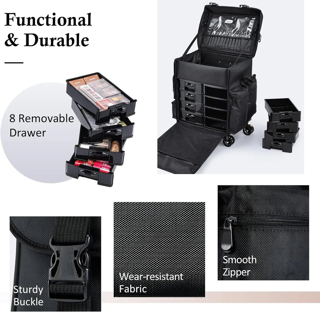 Professional Makeup Case, 2in1 Travel Rolling Case Soft Sided Cosmetology Train Case with Wheels Makeup Artist Cosmetic Organize