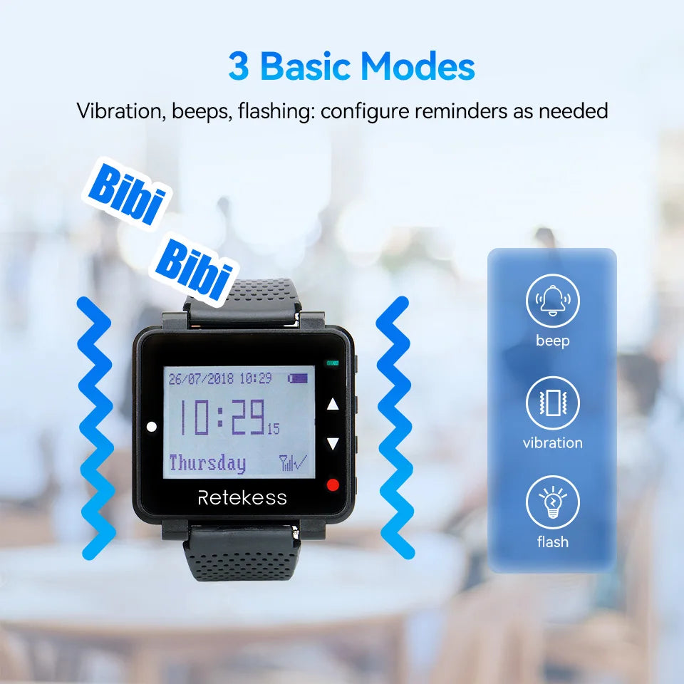 Receiving watch transmission distance:50 meters indoors, 80 meters outdoors.When using the button, enough to cover the entire workplace.The actual distance is affected by the environment.
