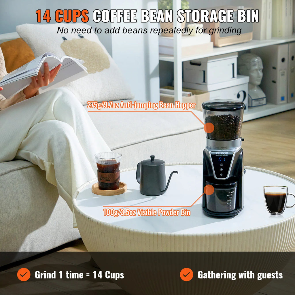 14 Cups Capacity: The large bean hopper can hold up to 275g (9.7oz) coffee beans, and grind up to 14 cups at one time. One serving of beans can satisfy multiple people sharing at the same time throughout the day.