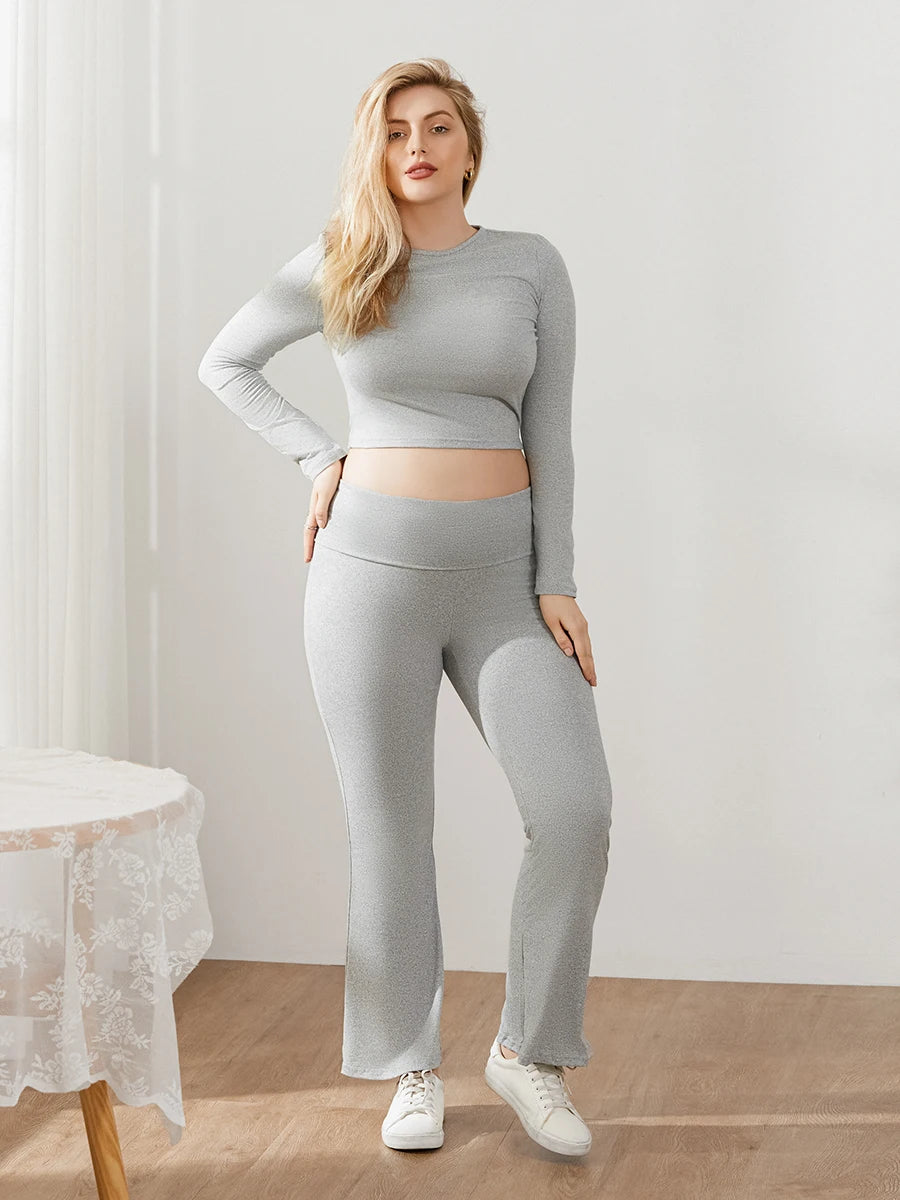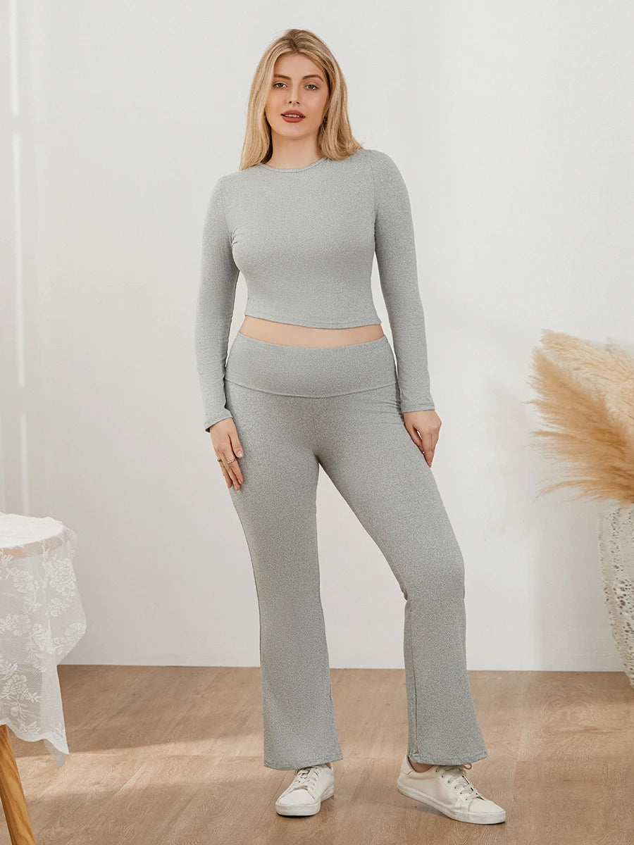 Women's Pants Outfits Solid Color Long Sleeve Boat Neck Crop Tops with Fold Over Trousers Set Streetwear