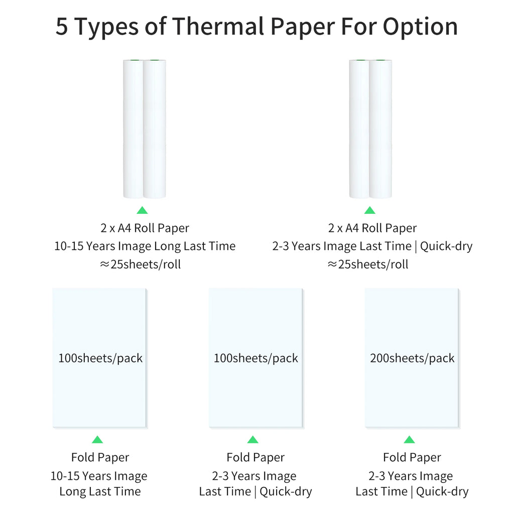 ♦ Roll Paper size - 210x30mm, about 7.45m/24.4ft, about 25 sheets A4 paper of each roll. Fold Paper Size - 210x297mm, and 2 kinds of packing quantity are optional - 100 sheets, 200 sheets.