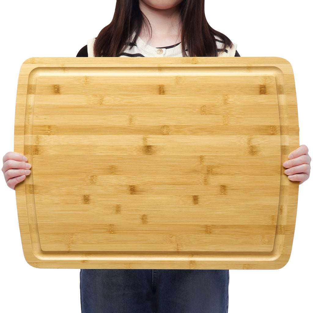 Extra Large Size: This bamboo cutting board boasts an extra-large surface area, providing ample space for all your chopping and slicing needs. Measuring generously, it accommodates large cuts of meat, whole turkeys, and large batches of vegetables, making it ideal for meal prep and entertaining.