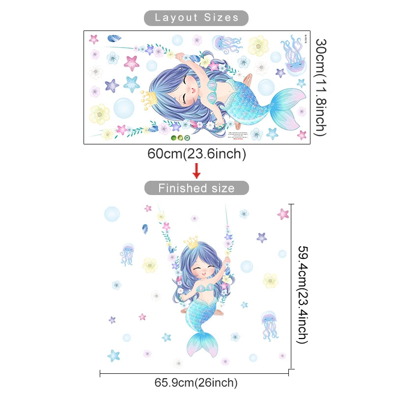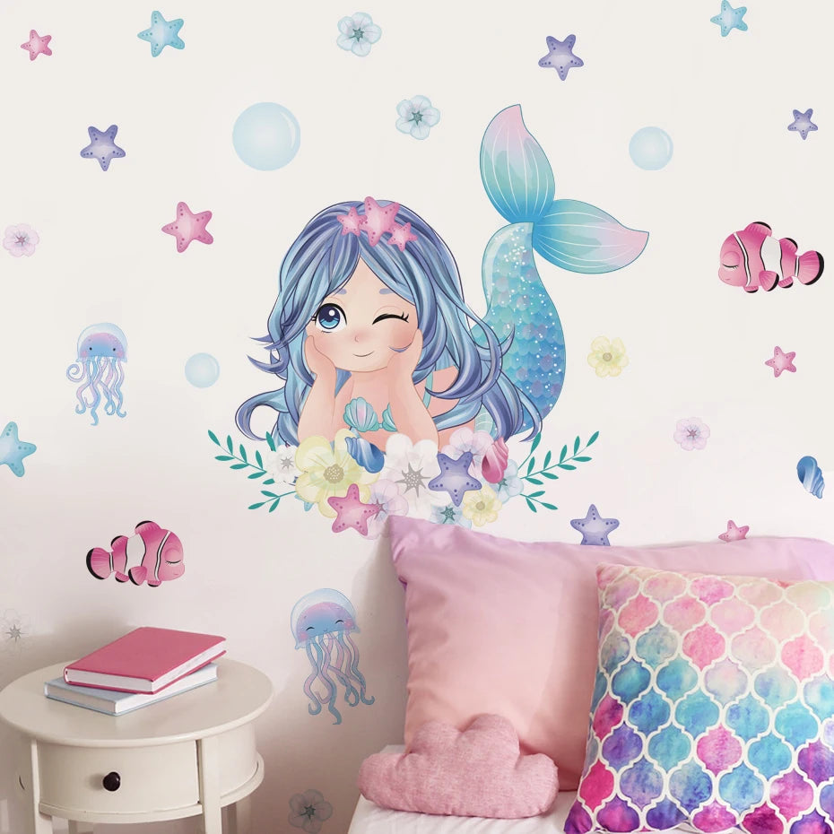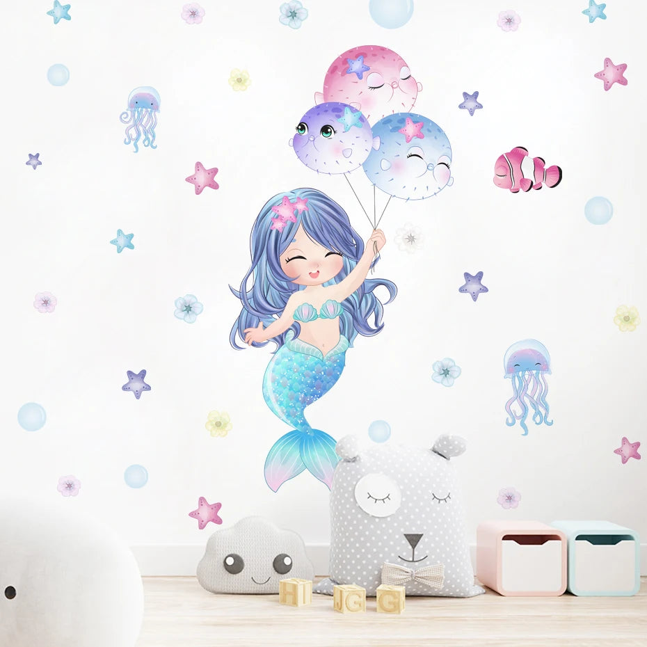 Cute Cartoon Mermaid Swinging Jellyfish Wall Stickers for Baby Girls Room Kids Room Wall Decals Nursery Living Room Decor