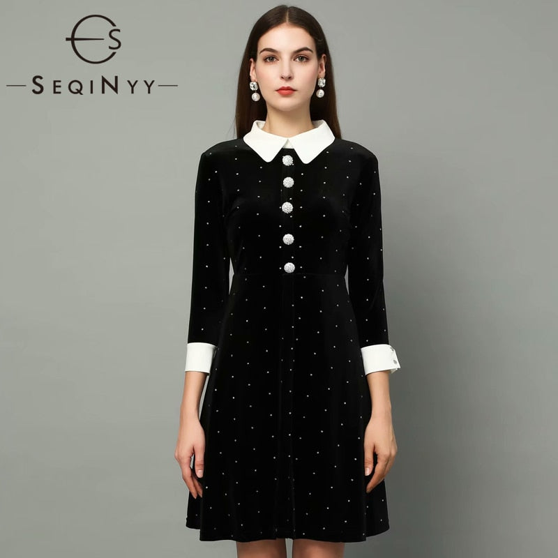 SEQINYY Velvet Dress 2020 Spring Autumn New Fashion Design Women 3/4 Sleeve Crystal Button Slim Bling Mini Black Dress