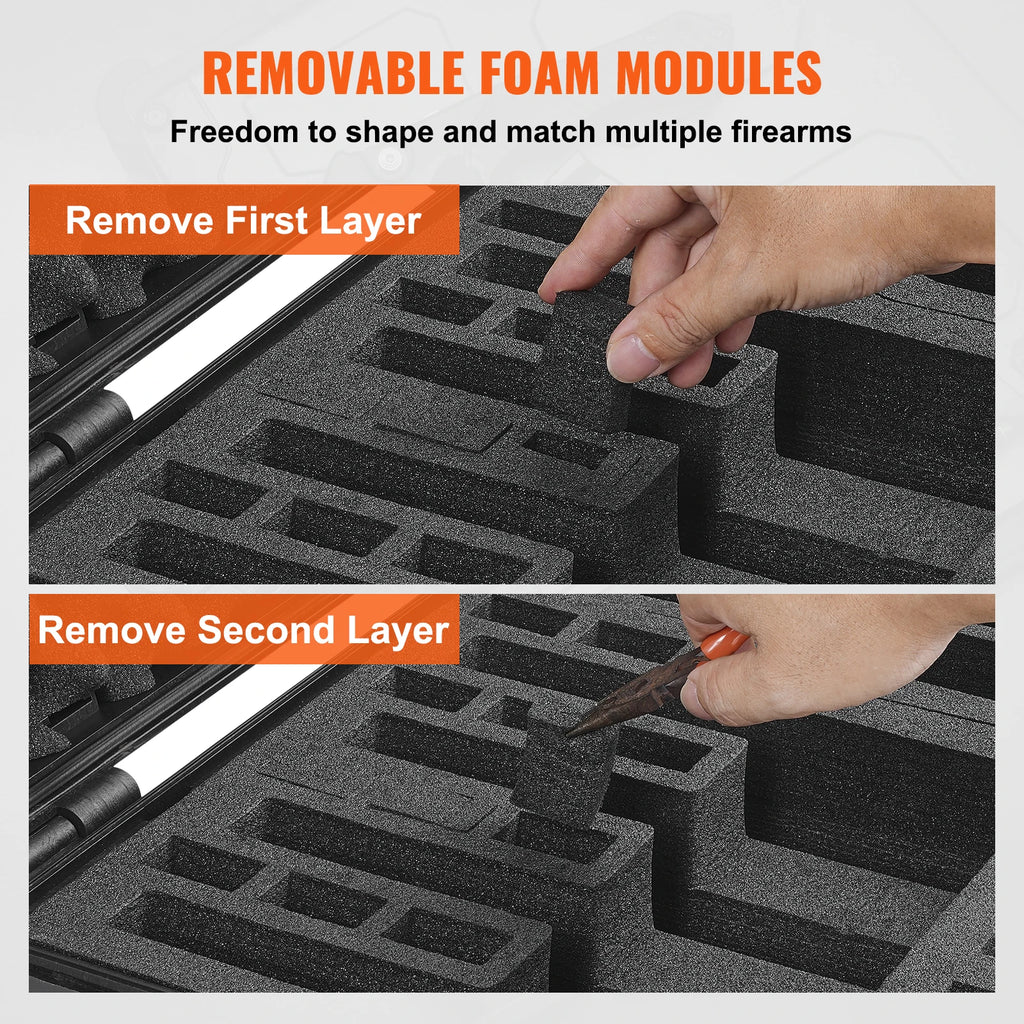 • Enhanced Durability and Interior Safety: Constructed from durable PP material, the case resists impacts and drops. Inside, multiple foam layers—including egg-crate foam, XPE inserts, and a padded base—ensure a snug fit, protecting firearms from scratches and movement.