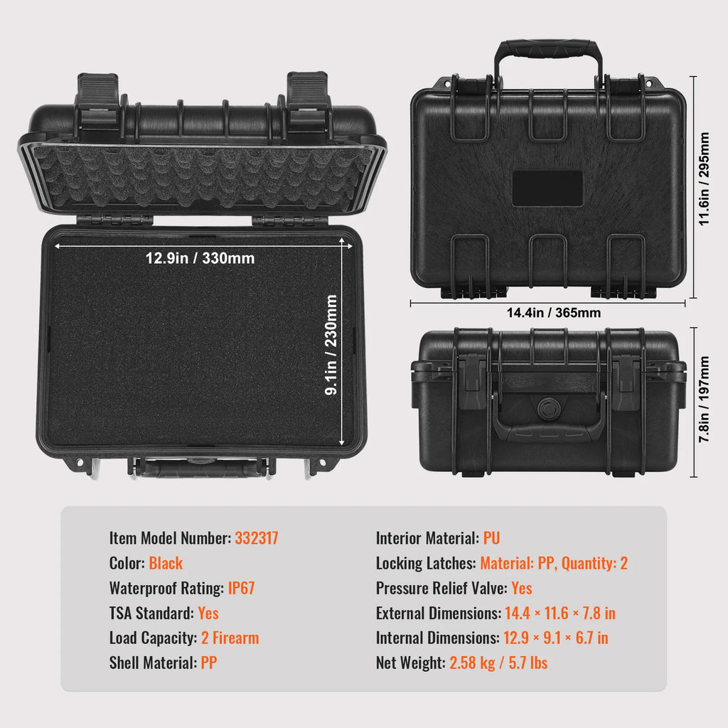 • External Dimensions: 491 × 434 × 211 mm (19.3 × 17.1 × 8.3 in) Internal Dimensions: 464 × 371 × 190 mm (18.3 × 14.6 × 7.5 in) Net Weight: 4.00 kg (8.8 lbs) Load Capacity: 6 Firearms Waterproof Rating: IP67 TSA Standard: Yes Shell Material: PP Interior Material: PU Locking Latches: Material: PP, Quantity: 2 Pressure Relief Valve: Yes Item Model Number: 453619 Color: Black/li>